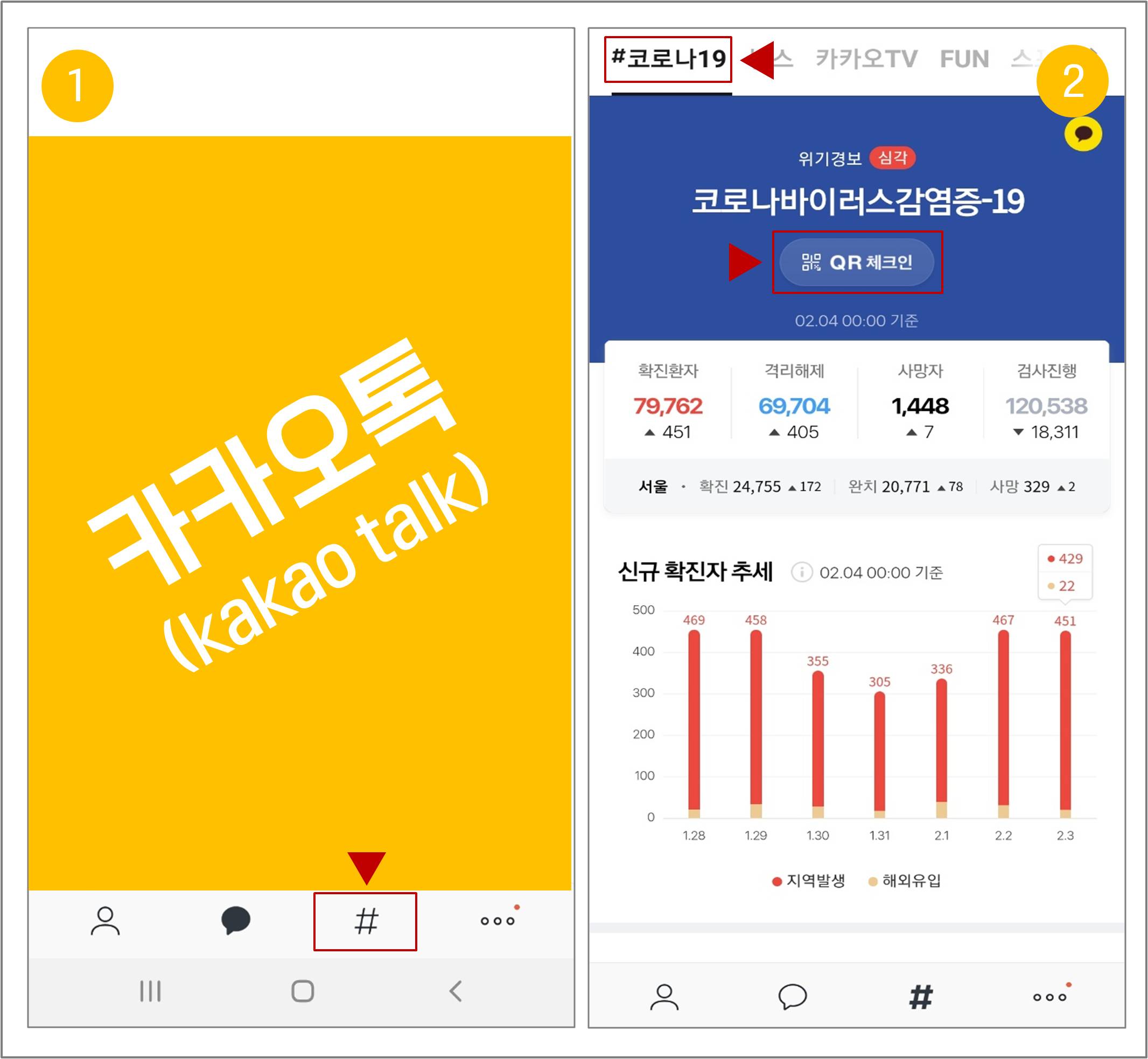 1~2단계, 카카오톡 실행 후 '샾(#)' 선택 / 상단 '코로나 19' 선택 / QR 체크인 선택